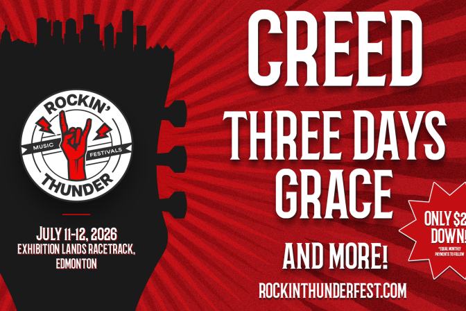 Exhibition Lands Race Track, Edmonton, AB Rockin’ Thunder 2026 is coming to Edmonton!Get ready for two massive days of live music as Creed and Three Days Grace take over Exhibition Lands Racetrack on July 11–12, 2026. This is the ultimate summer weekend for rock fans — high-energy performances, an unbeatable festival atmosphere, and a lineup designed to take you straight back […]