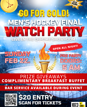 Deerfoot Inn & Casino, 11500 – 35 Street SE, Calgary Join us in the Chrome Showroom to watch the Men’s Hockey Final Game as the top two teams battle for Gold! Includes a complimentary breakfast buffet, and a chance to win some great prizes. Bar Service will be available during the event. Doors: 5AM Game Start: Approx 6:10AM Get your tickets now!