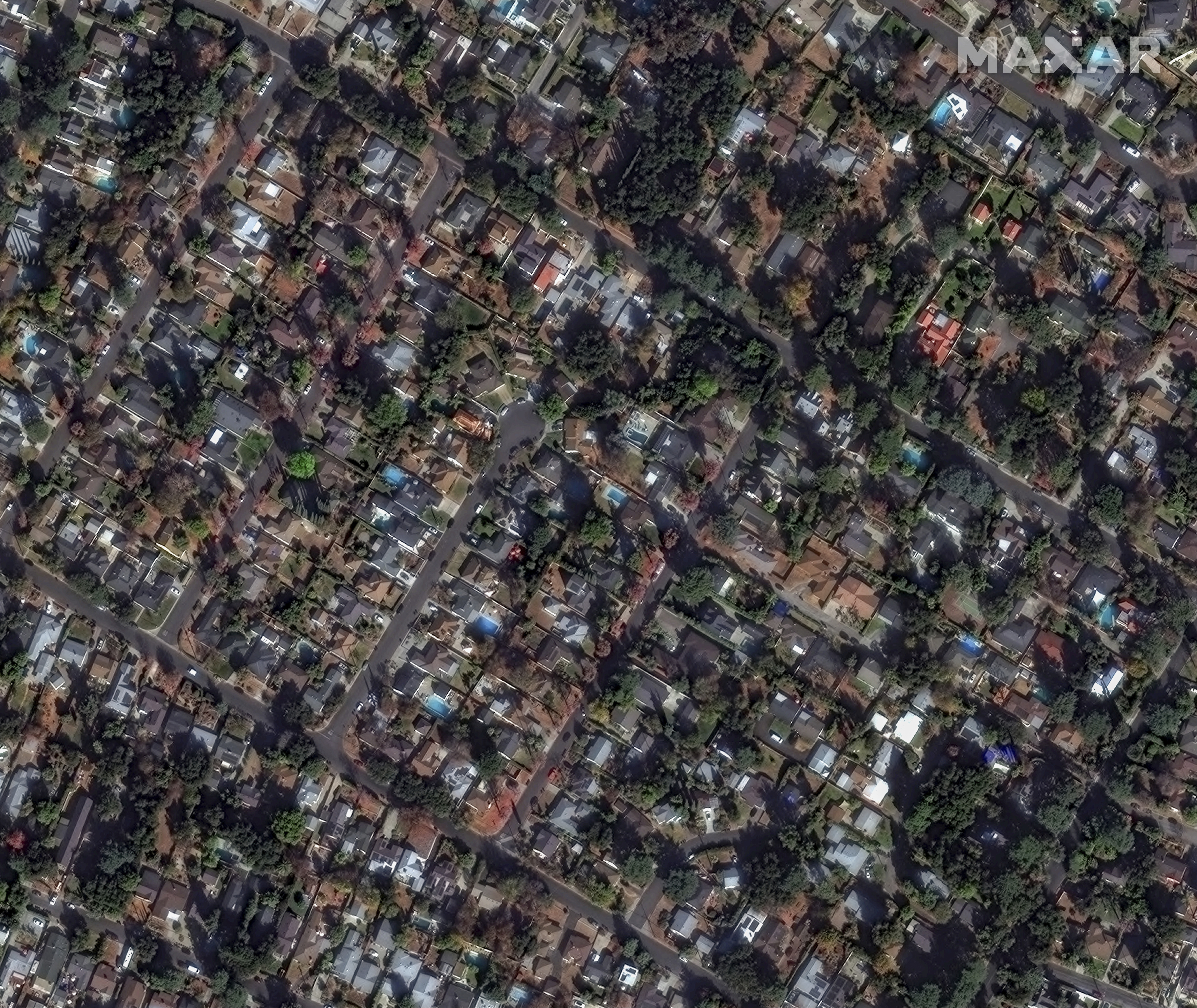 Drag the button to see before and after Maxar satellite imagery of burning and destroyed houses from the Eaton Fire near Marathon Road on Wed., Jan. 8, 2025, in Altadena, Calif.